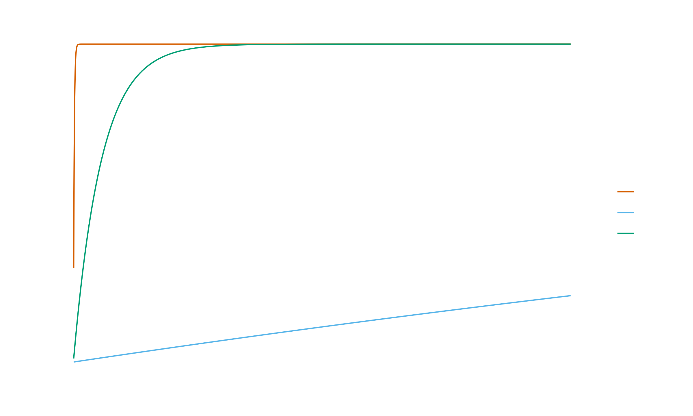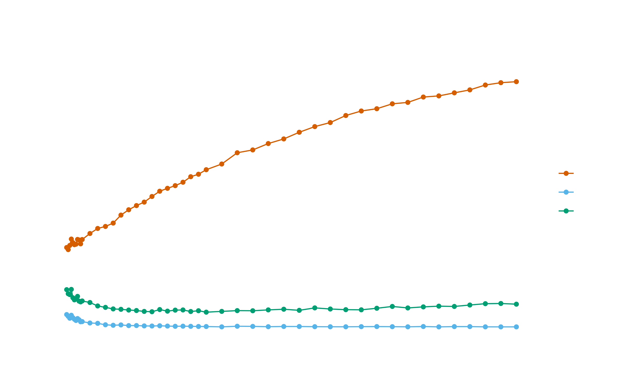 Extending the simulation to larger sample sizes shows this conclusion is incorrect. Expanding the analysis to $n \leq 10\,000$ reveals a different pattern: