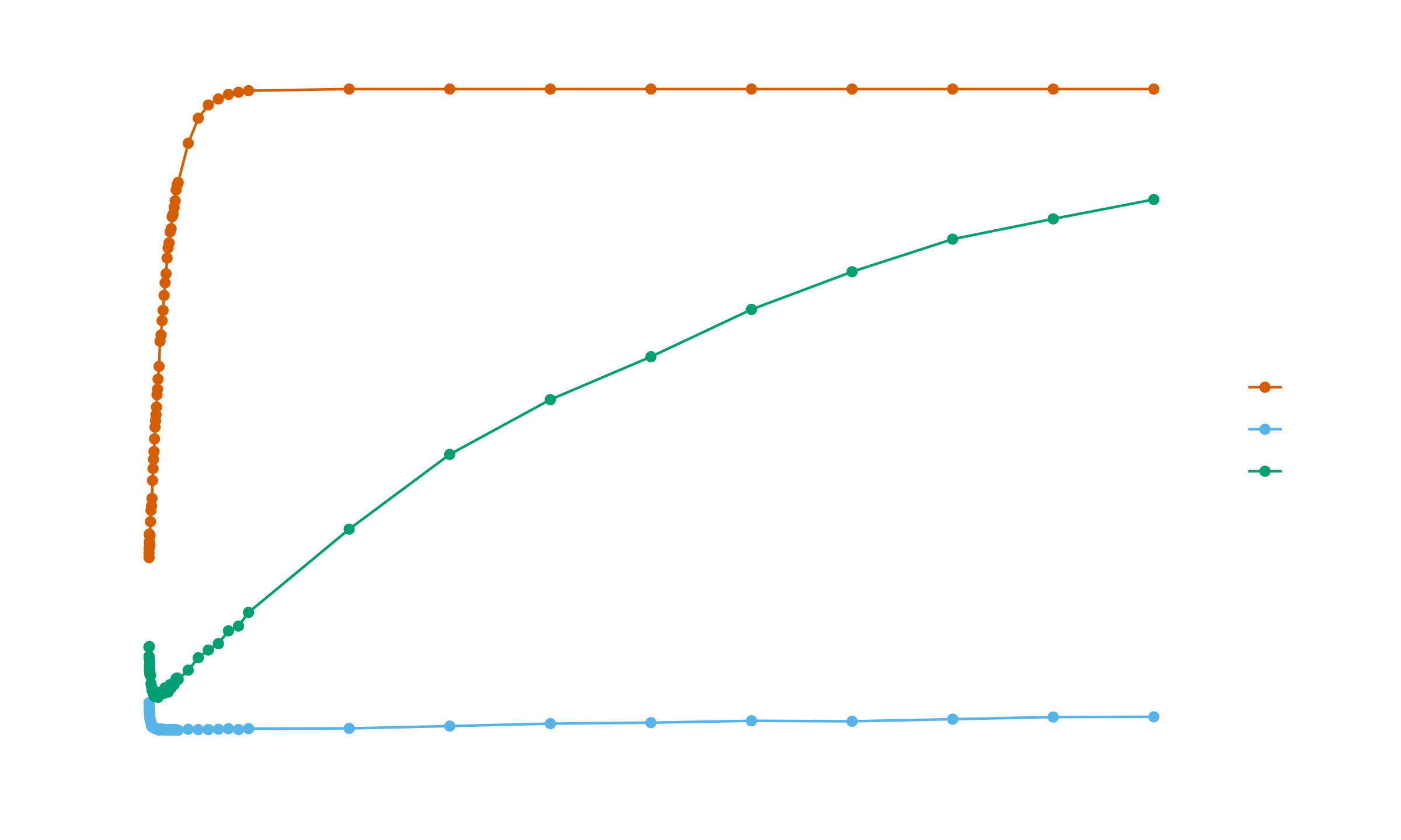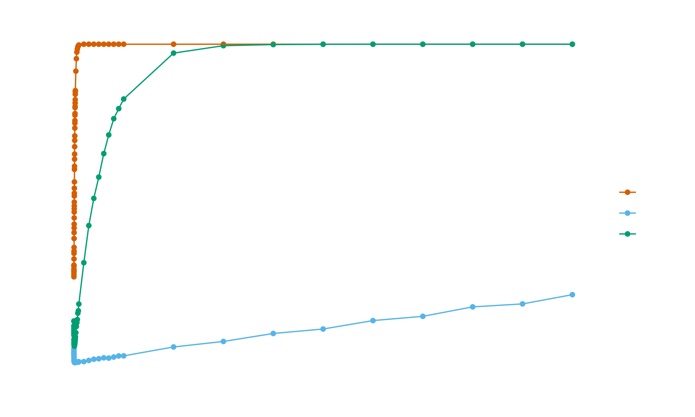 These formulas explain the convergence patterns observed in the simulation for large samples. All three methods eventually reach perfect detection (rate $\to 1$) as $n \to \infty$, but convergence speed differs by orders of magnitude. The asymptotic per-point probabilities determine this speed: $k = 1.5$ has $p \approx 0.007$, Carling has $p \approx 0.000178$, and $k = 3.0$ has $p \approx 0.0000024$.