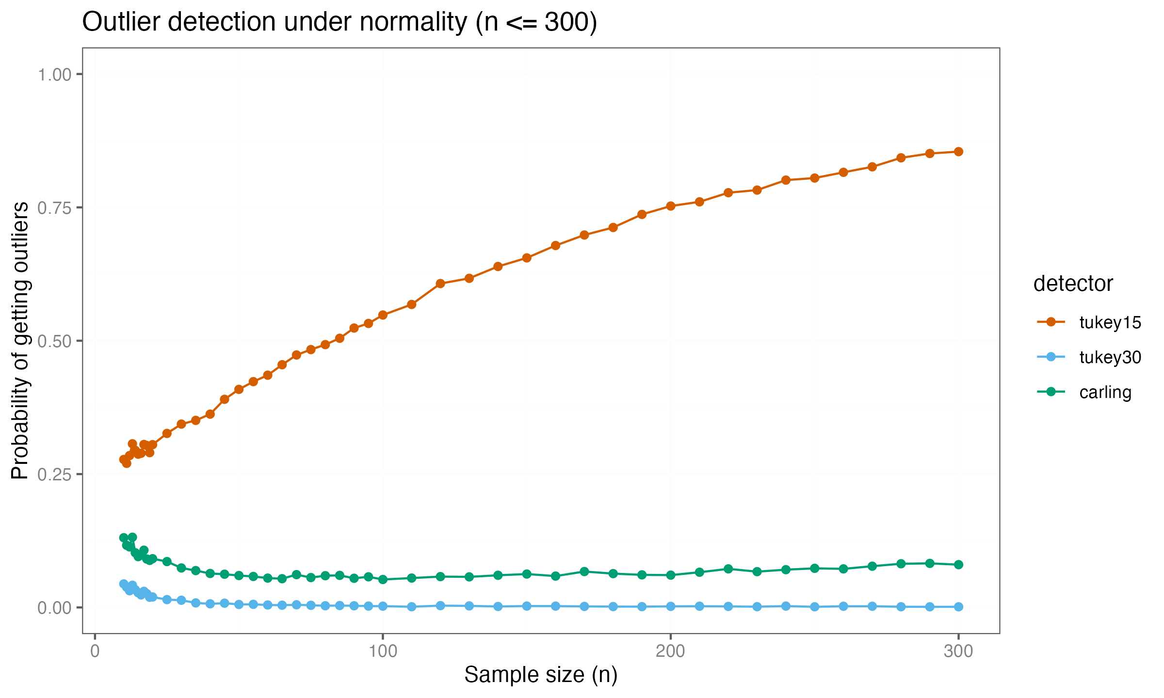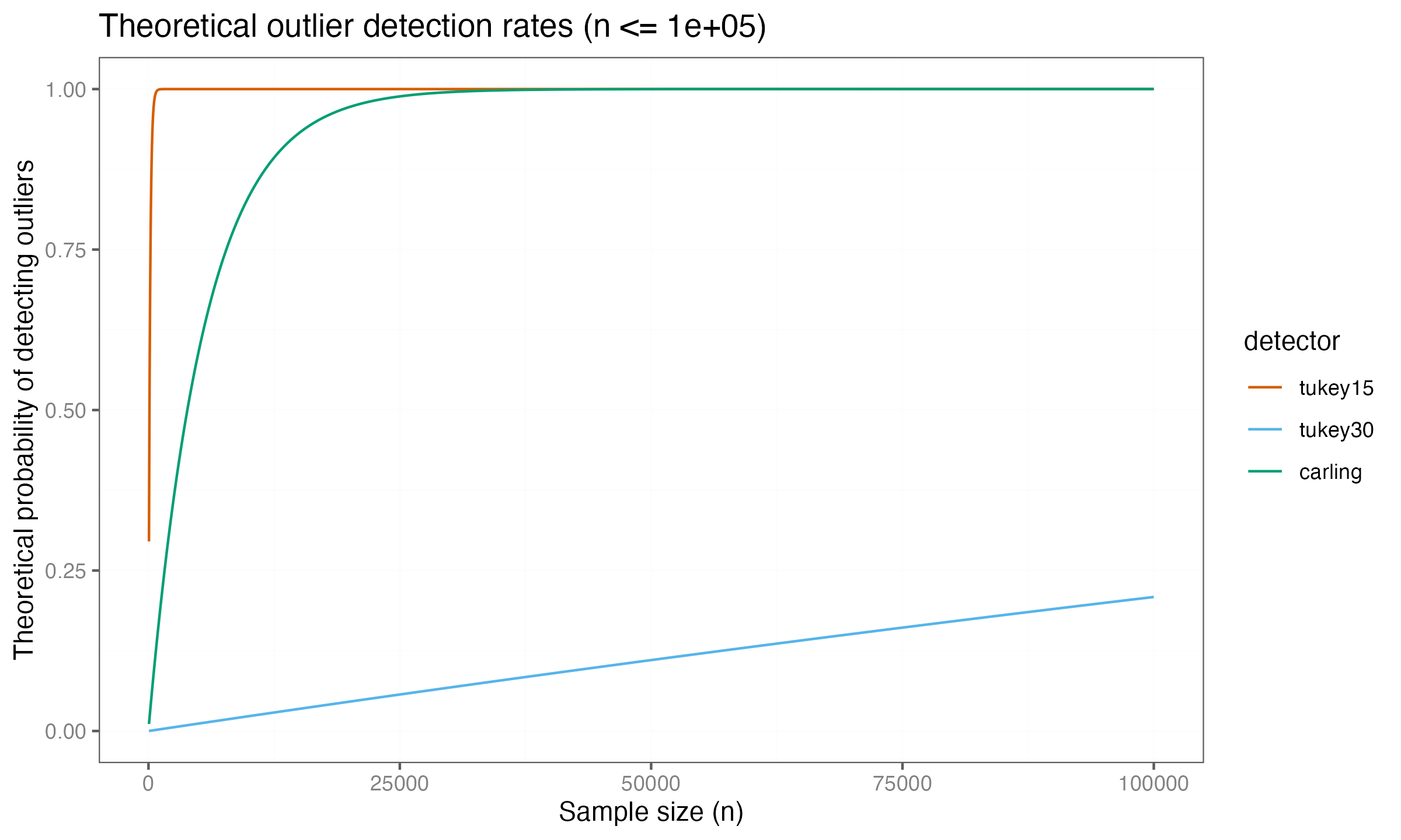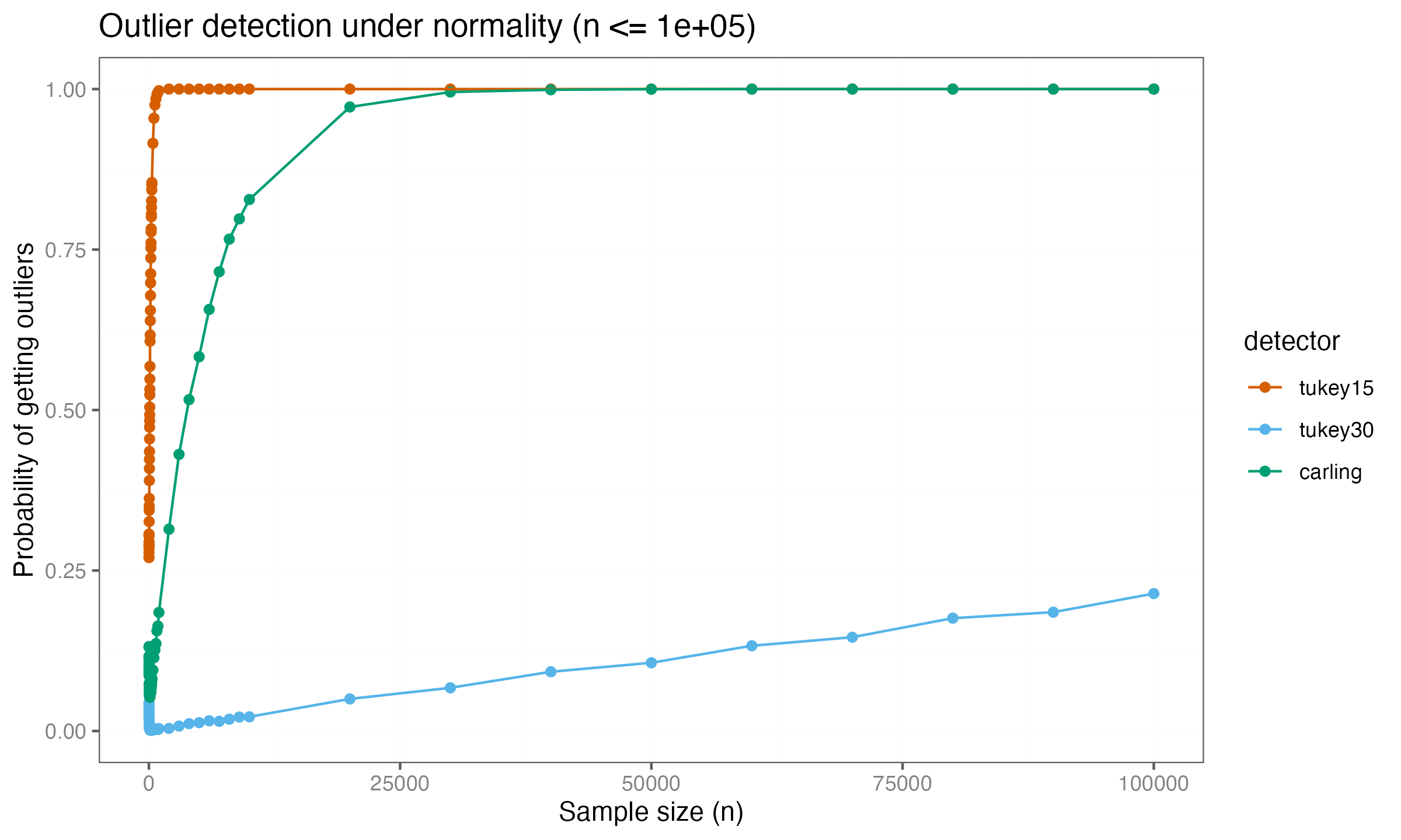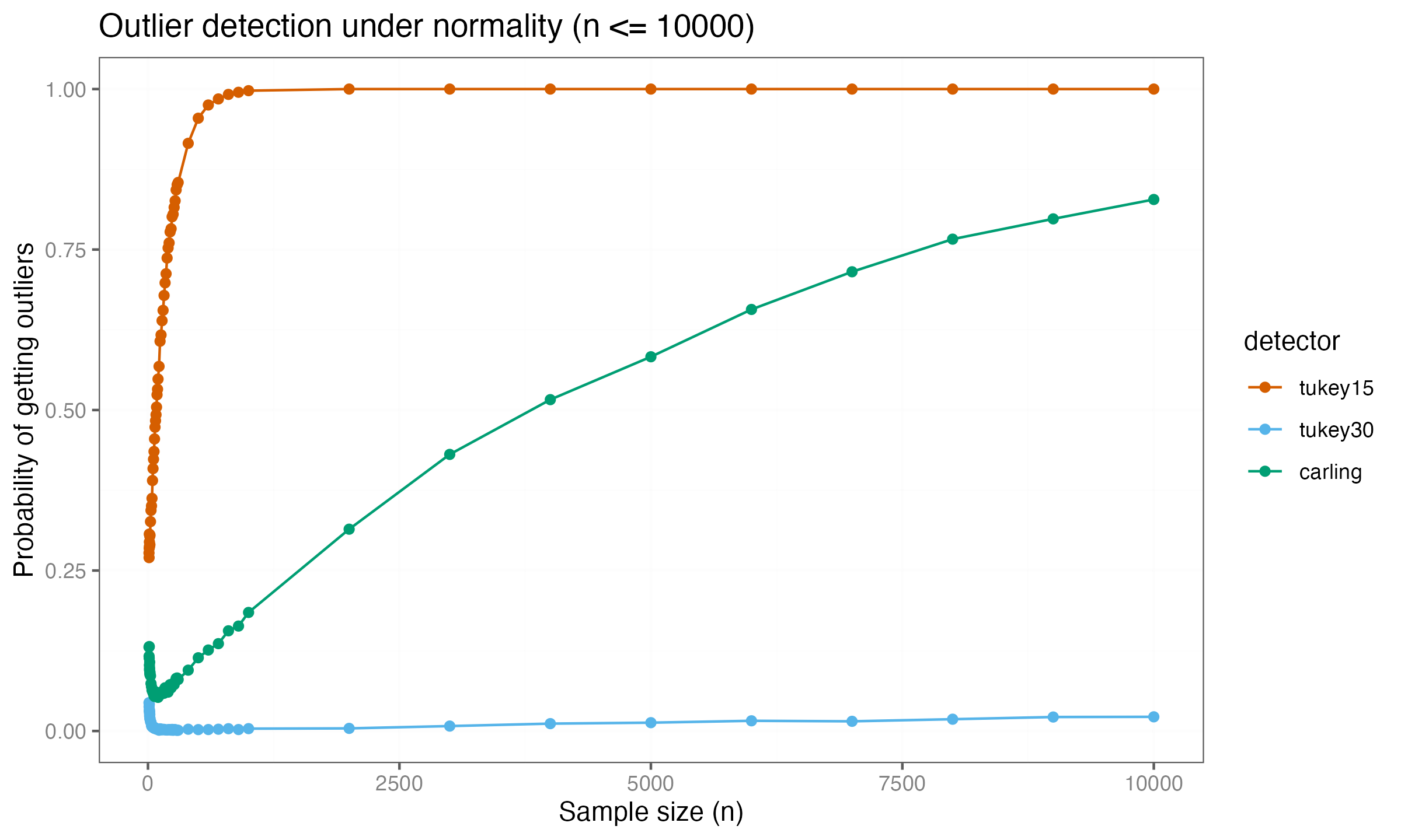 Carling’s method now shows convergence toward a detection rate of $1.0$, indicating that it eventually classifies all values as outliers for sufficiently large samples. The $k = 3.0$ threshold remains near zero at this scale.
